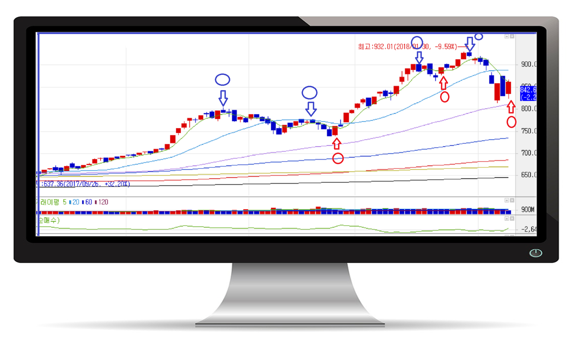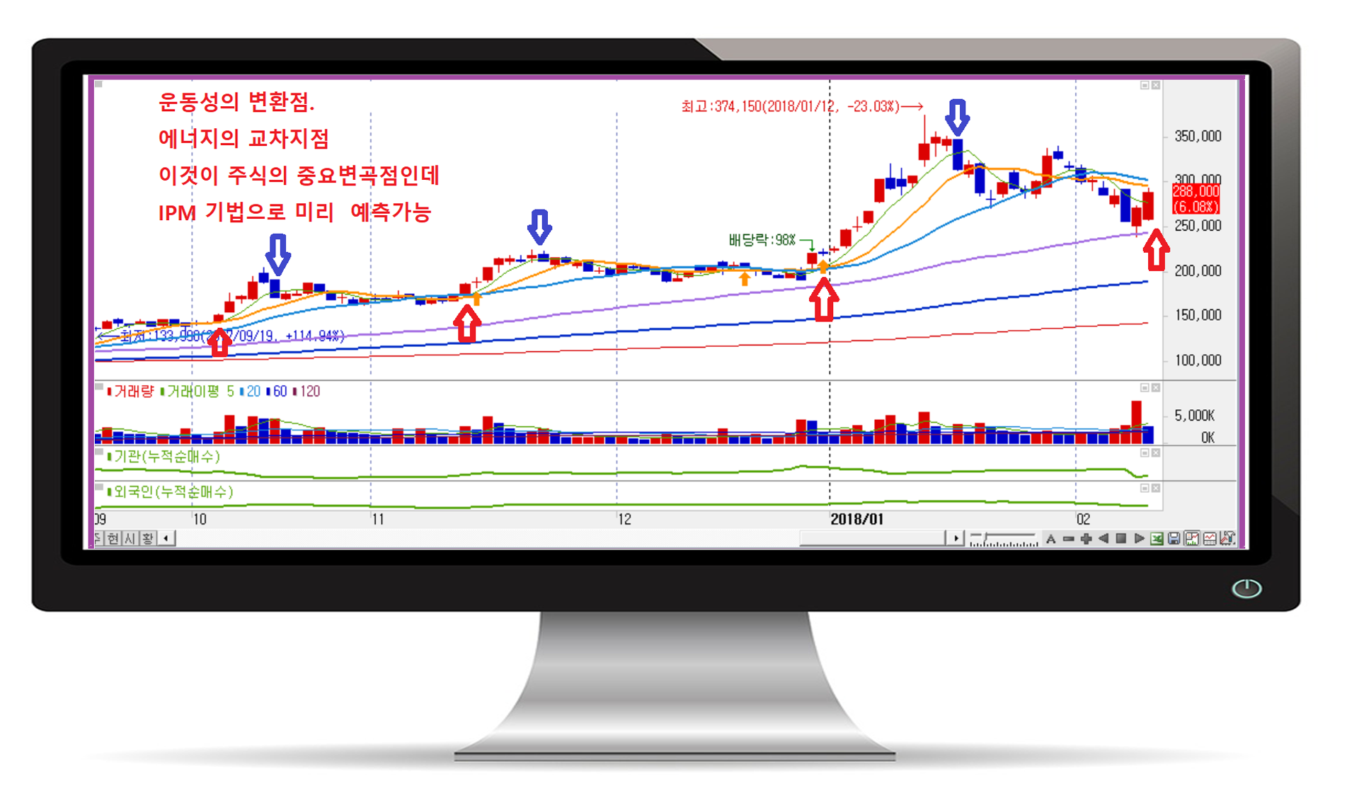 법칙의 알고리즘을 찾기 위해 부동산분야에 이어 금융분야인 주식을 세분화하여 연구한 결과 럭비공같은 주식장도 전체 시장인 지수와 각 종목별 각각에 가격상승과 하락운동의 변곡점이 매주기마다 형성된다는 것을 확인했습니다.